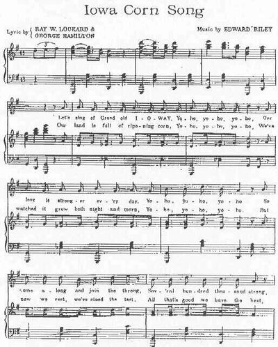 This famous song was written by George Hamilton, secretary of the Des Moines Chamber of Commerce and a big man in the Masonic Lodge, particularly among Shriners, with later help from Prof. John T. Beeston, the well known band leader. Ray W. Lockard's name appears on the original musical score as a co-writer of the song. The actual "official" song for the state of Iowa is The Song Of Iowa, written by S.H.M. Byers in 1897. But, the best know and most popular song for the state of Iowa is the famous Iowa Corn Song.