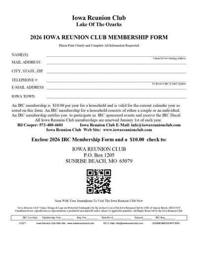 IRC Membership Form: The Iowa Reunion Club has an IRC OnLine Printable Membership Forms for you to print and join the IRC. To use the "Print & Fill PDF Membership Form" click on the PDF - Membership Form link below or click on the IRC Membership Form under "Membership" in the menu above and then follow the instructions provided for you.